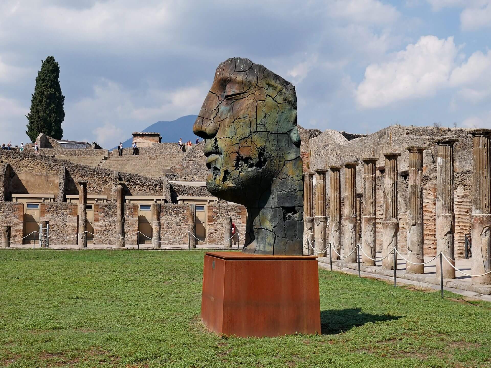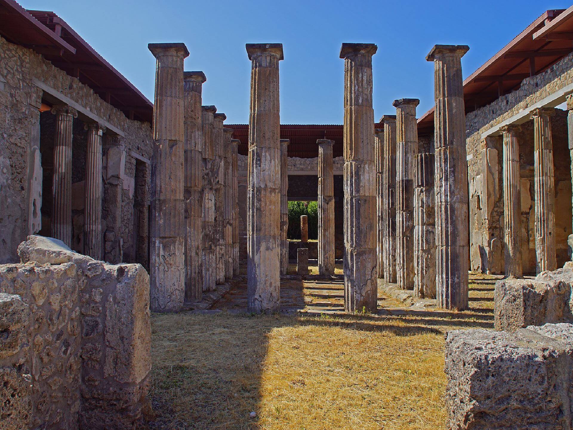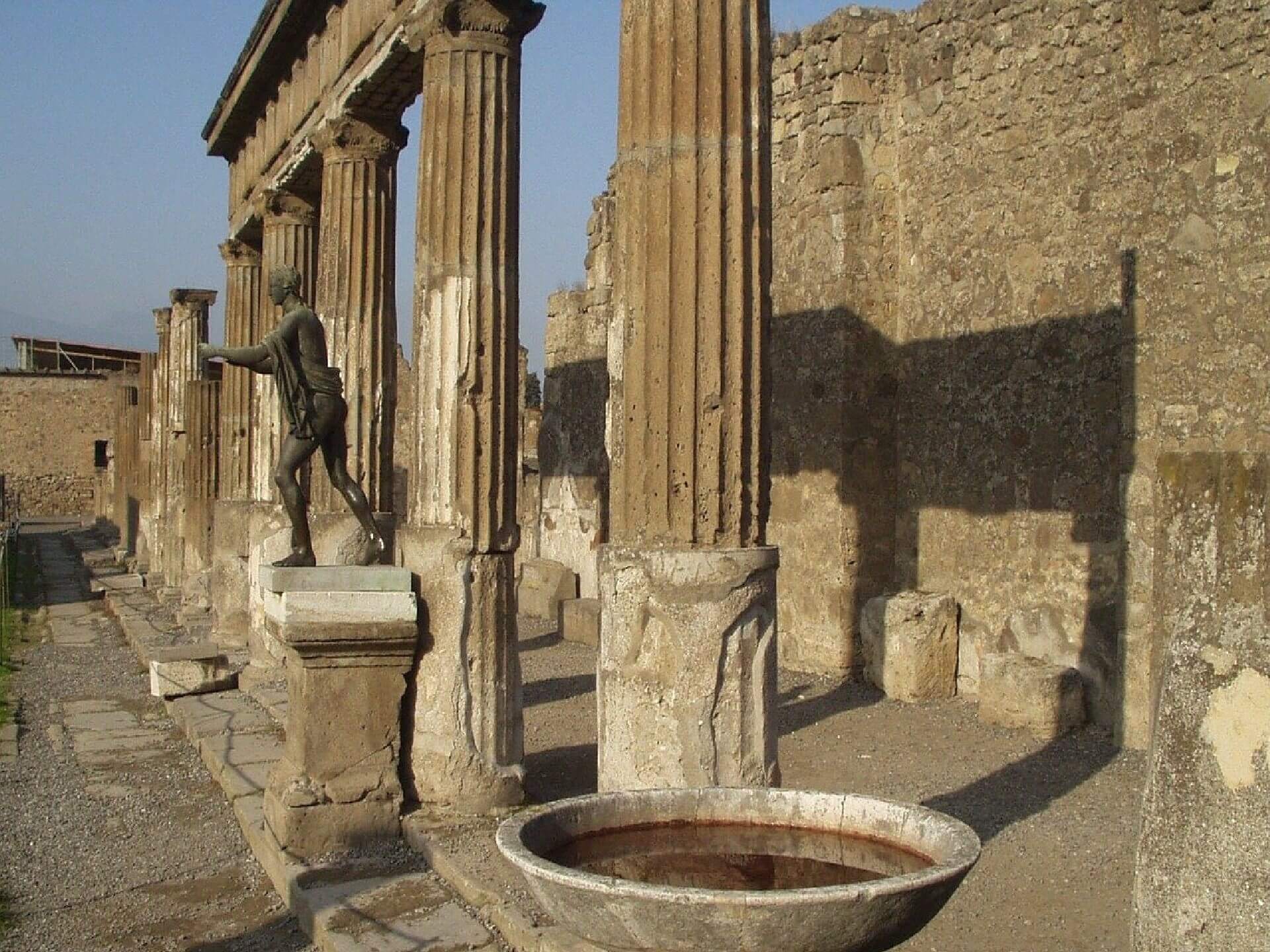 Am 25. August 79 n. Chr. ein Gebrüll weckte die Einwohner von Pompeji. Bald darauf stieg eine 20 Kilometer lange Rauchsäule vom Gipfel des Vesuvs auf. In kurzer Zeit wurde die Stadt unter einer dicken Aschedecke begraben, während die durch die durch die Explosion freigesetzten giftigen Gase vergiftete Luft ihre Bewohner tötete. Diejenigen, die keine Zeit hatten, an die Küste zu fliehen, wurden für immer in dieser Hölle begraben, wie die versteinerten Leichen beweisen, die zu uns herabgekommen sind. Die Lava versteinerte die Stadt, wie sie an diesem Morgen des 25. August vor zweitausend Jahren aussah. Aus diesem Grund bieten die Villen und Häuser von Pompeji eine einzigartige Gelegenheit, die Schönheiten der römischen Zivilisation zu bewundern.