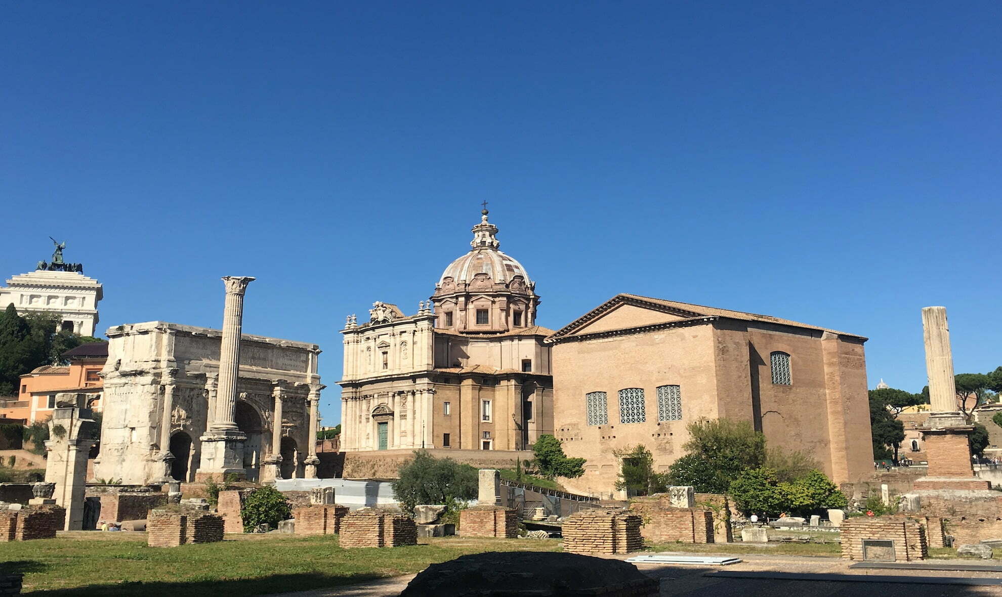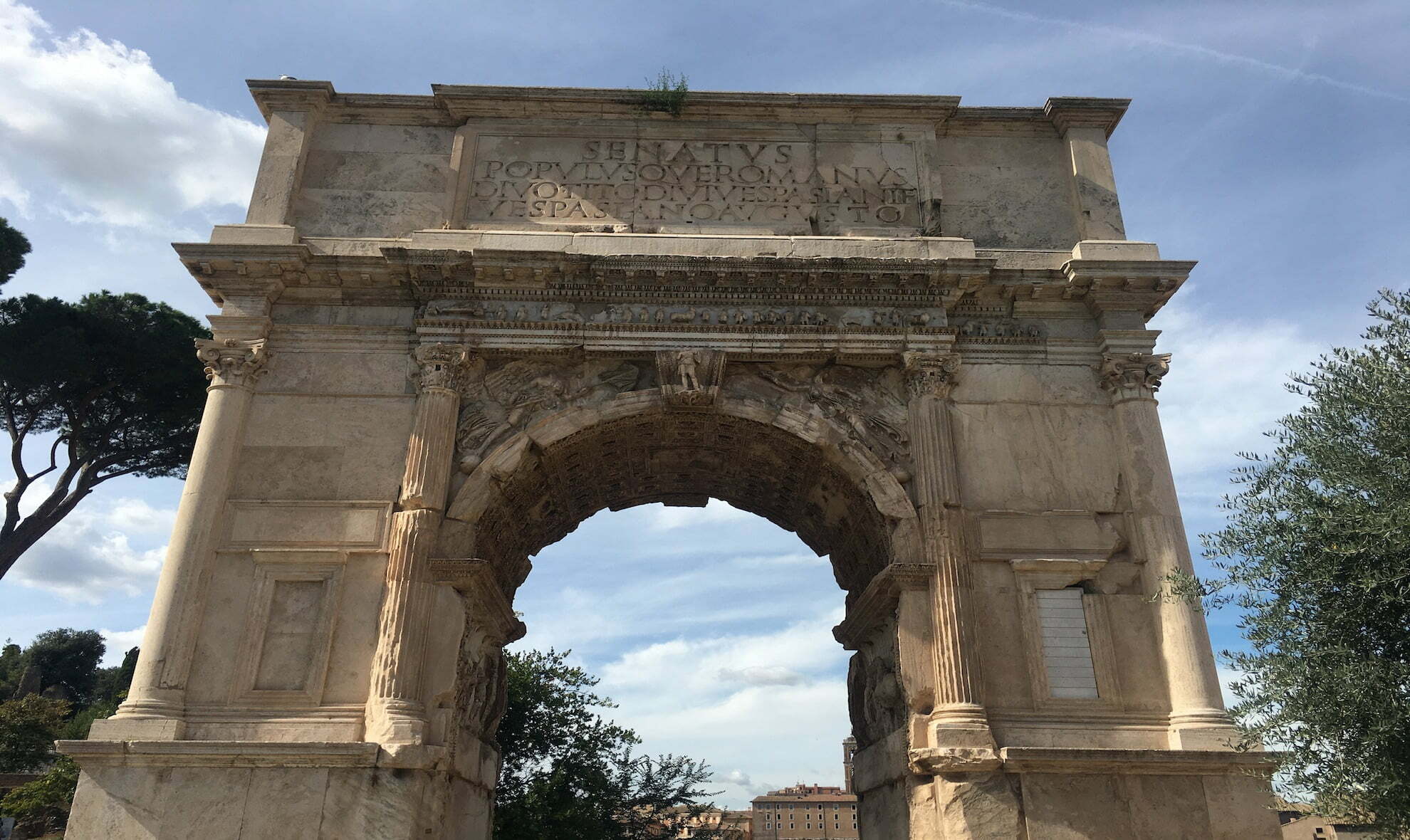 The Arch of Constantine, built to mark the triumph of the Battle of the Milvian Bridge, where, according to legend, Emperor Constantine converted to Christianity, rises reverently next to the Colosseum.